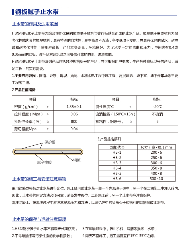 鋼板膩子止水帶主要應用范圍:隧道、地鐵、堤壩、涵洞、水利水電工程中施工縫、高層建筑地下室、地下停車場等主要工程施工縫。